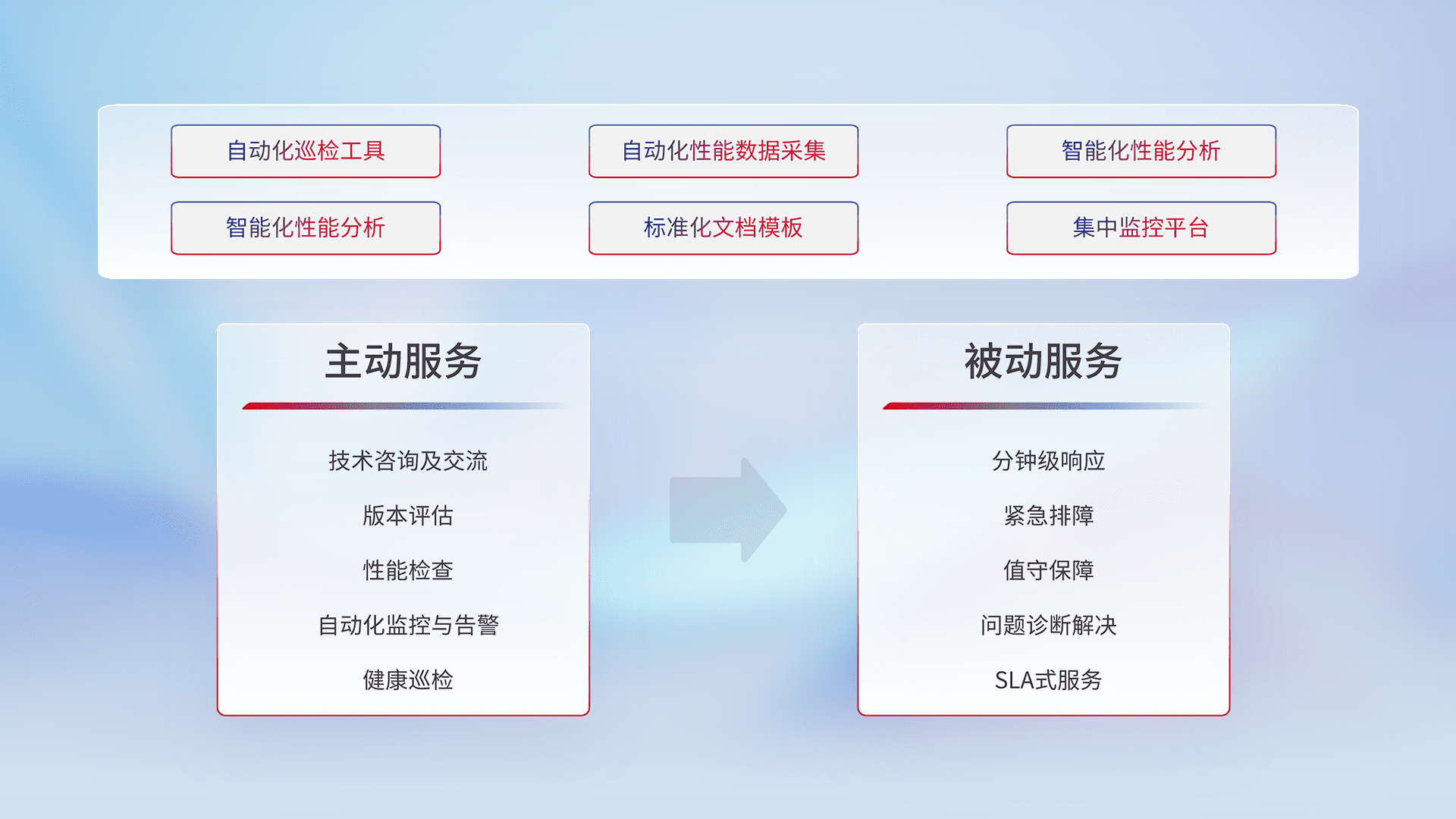 智能化工具和标准化文档,,,,保障服务质量,,提供主动服务(包含技术咨询、、、版本评估、、、性能检查、、、、自动化监控与告警、、、健康巡检)和被动服务包含(分钟级响应、、、紧急排障、、值守保障、、、问题诊断解决、、、SLA服务)。。。。